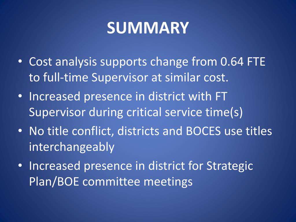 SUMMARY • Cost analysis supports change from 0.64 FTE to full-time Supervisor at similar cost. • Increased presence in district with FT Supervisor during critical service time(s) • No title conflict, districts and BOCES use titles interchangeably • Increased presence in district for Strategic Plan/BOE committee meetings