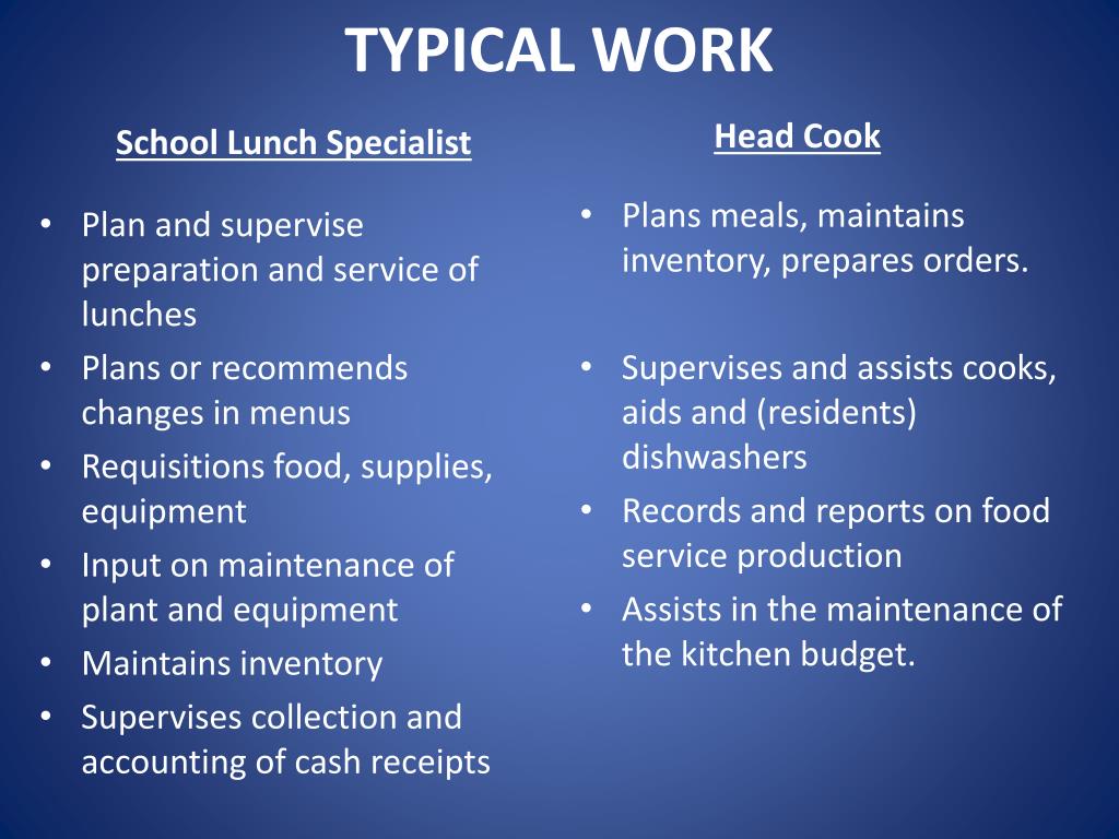 TYPICAL WORK School Lunch Specialist Head Cook Plans meals, maintains inventory, prepares orders. Supervises and assists cooks, aids and (residents) dishwashers Records and reports on food service production Assists in the maintenance of the kitchen budget. • Plan and supervise preparation and service of lunches • Plans or recommends changes in menus • Requisitions food, supplies, equipment • Input on maintenance of plant and equipment • Maintains inventory • Supervises collection and accounting of cash receipts
