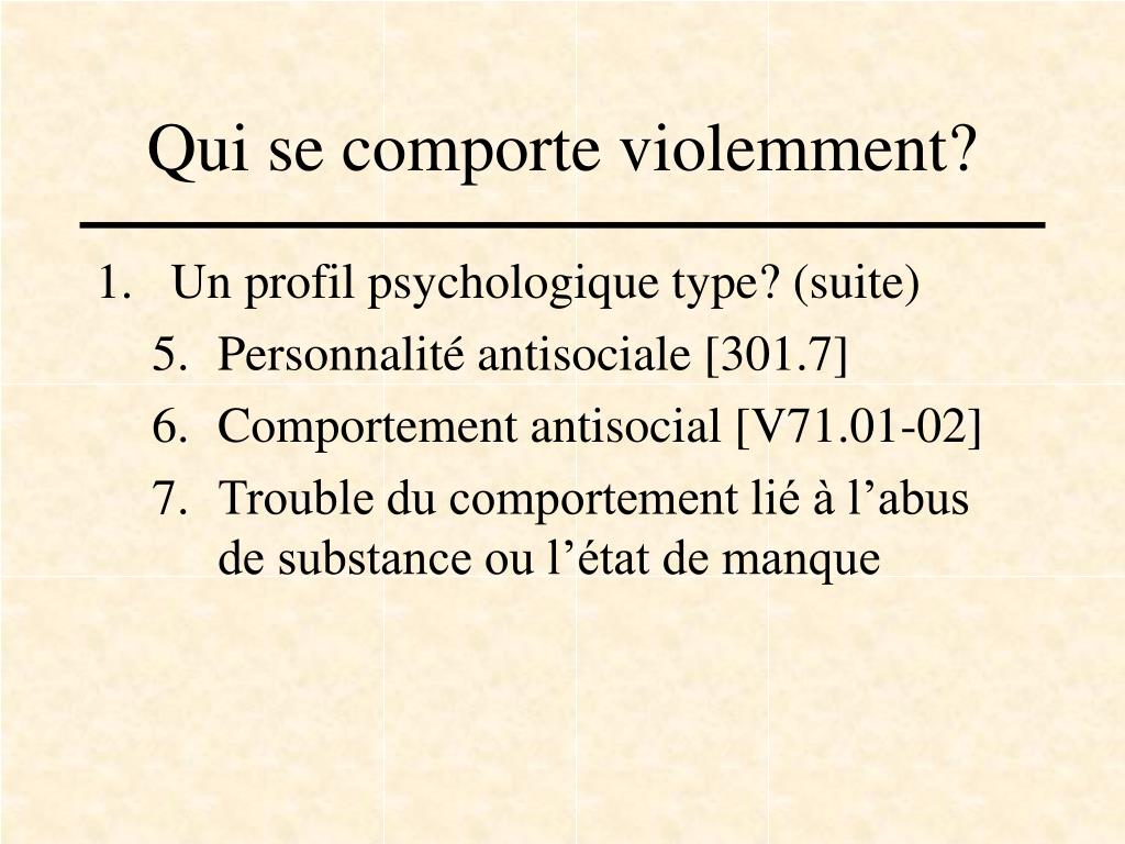 Qui se comporte violemment? • Un profil psychologique type? (suite) • Personnalité antisociale [301.7] • Comportement antisocial [V71.01-02] • Trouble du comportement lié à l’abus de substance ou l’état de manque