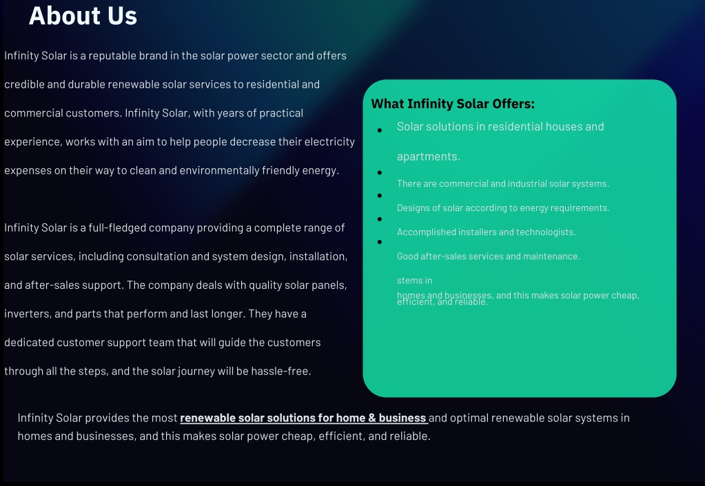About Us Infinity Solar is a reputable brand in the solar power sector and offers credible and durable renewable solar services to residential and What Infinity Solar Offers: commercial customers. Infinity Solar, with years of practical Solar solutions in residential houses and experience, works with an aim to help people decrease their electricity apartments. expenses on their way to clean and environmentally friendly energy. There are commercial and industrial solar systems. Designs of solar according to energy requirements. Infinity Solar is a full-fledged company providing a complete range of Accomplished installers and technologists. solar services, including consultation and system design, installation, Good after-sales services and maintenance. stems in homes and businesses, and this makes solar power cheap, efficient, and reliable. and after-sales support. The company deals with quality solar panels, inverters, and parts that perform and last longer. They have a dedicated customer support team that will guide the customers through all the steps, and the solar journey will be hassle-free. Infinity Solar provides the most renewable solar solutions for home & business and optimal renewable solar systems in homes and businesses, and this makes solar power cheap, efficient, and reliable.