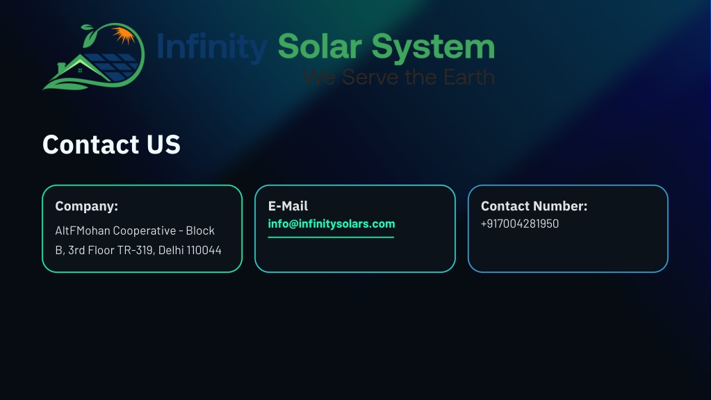 Contact US E-Mail info@infinitysolars.com Contact Number: +917004281950 Company: AltFMohan Cooperative - Block B, 3rd Floor TR-319, Delhi 110044