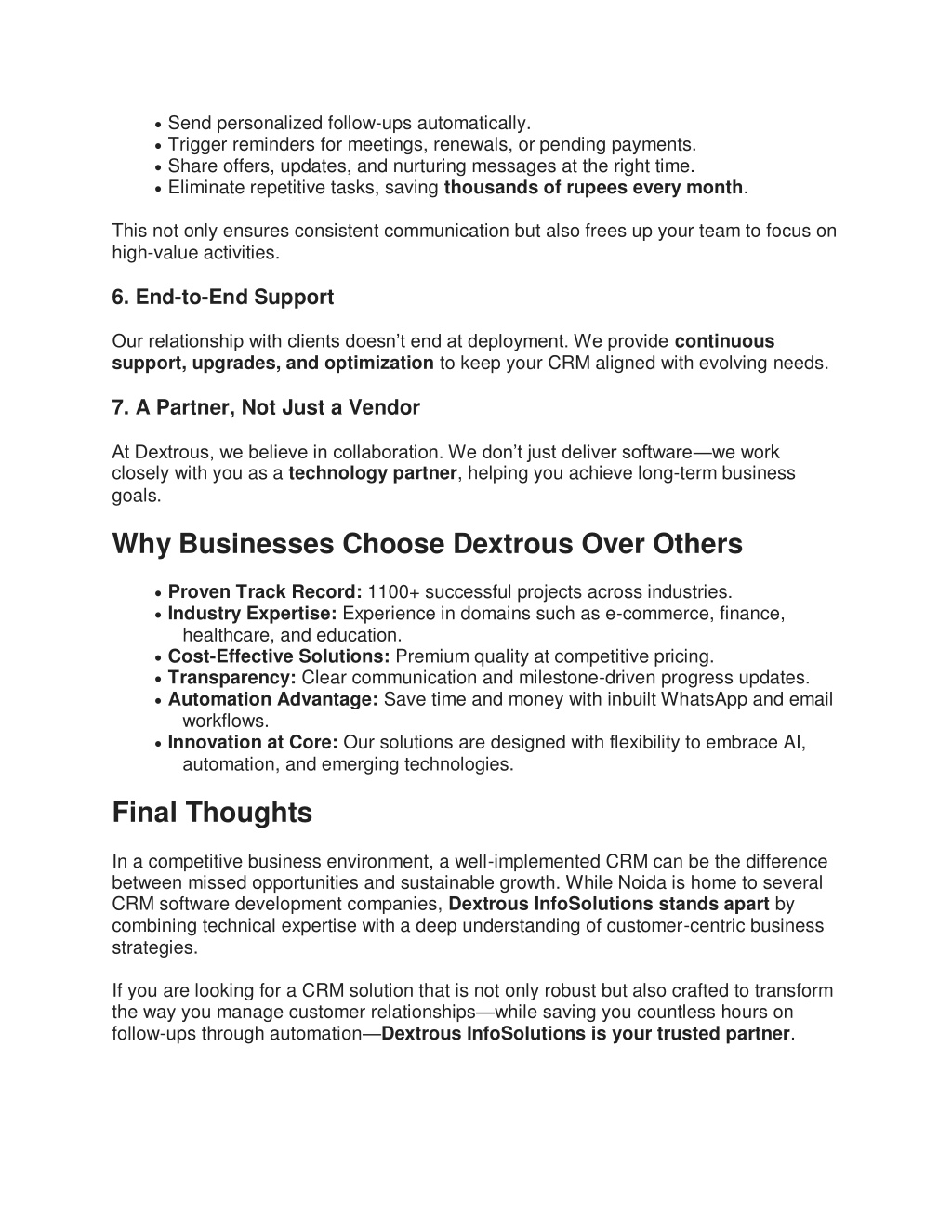 Send personalized follow-ups automatically. Trigger reminders for meetings, renewals, or pending payments. Share offers, updates, and nurturing messages at the right time. Eliminate repetitive tasks, saving thousands of rupees every month. This not only ensures consistent communication but also frees up your team to focus on high-value activities. 6. End-to-End Support Our relationship with clients doesn’t end at deployment. We providecontinuous support, upgrades, and optimization to keep your CRM aligned with evolving needs. 7. A Partner, Not Just a Vendor At Dextrous, we believe in collaboration. We don’t just deliver software—we work closely with you as a technology partner, helping you achieve long-term business goals. Why Businesses Choose Dextrous Over Others Proven Track Record: 1100+ successful projects across industries. Industry Expertise: Experience in domains such as e-commerce, finance, healthcare, and education. Cost-Effective Solutions: Premium quality at competitive pricing. Transparency: Clear communication and milestone-driven progress updates. Automation Advantage: Save time and money with inbuilt WhatsApp and email workflows. Innovation at Core: Our solutions are designed with flexibility to embrace AI, automation, and emerging technologies. Final Thoughts In a competitive business environment, a well-implemented CRM can be the difference between missed opportunities and sustainable growth. While Noida is home to several CRM software development companies, Dextrous InfoSolutions stands apart by combining technical expertise with a deep understanding of customer-centric business strategies. If you are looking for a CRM solution that is not only robust but also crafted to transform the way you manage customer relationships—while saving you countless hours on follow-ups through automation—Dextrous InfoSolutions is your trusted partner.