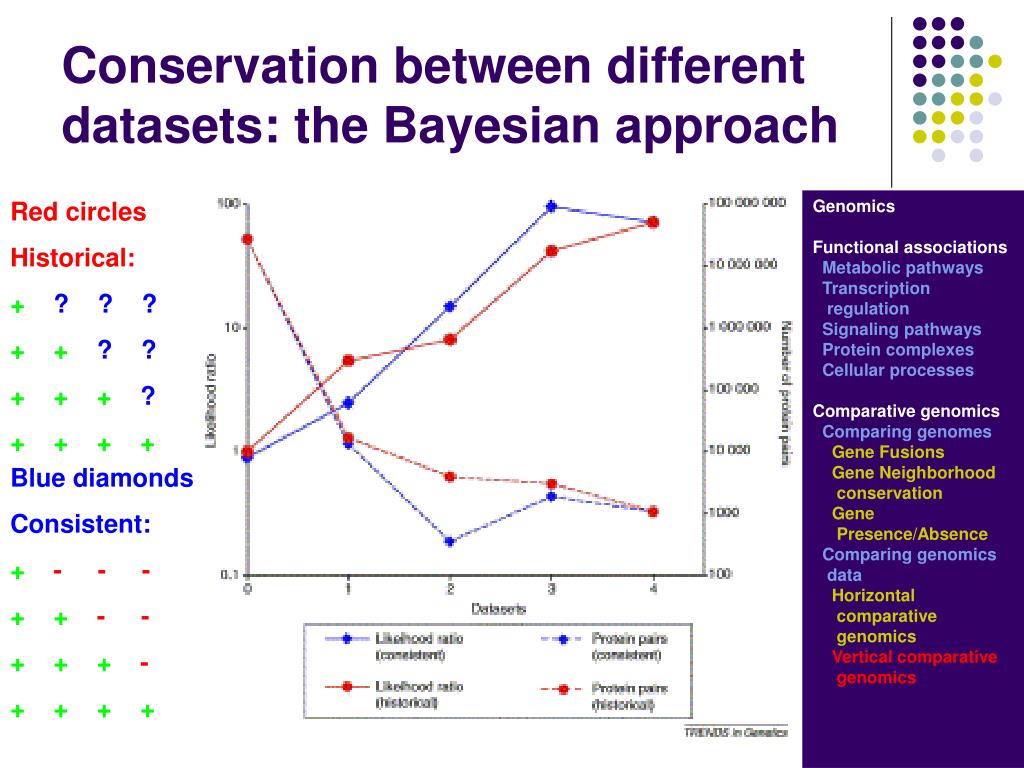 Conservation between different datasets: the Bayesian approach Red circles Historical: + ? ? ? + + ? ? + + + ? + + + + Genomics Functional associations Metabolic pathways Transcription regulation Signaling pathways Protein complexes Cellular processes Comparative genomics Comparing genomes Gene Fusions Gene Neighborhood conservation Gene Presence/Absence Comparing genomics data Horizontal comparative genomics Vertical comparative genomics Blue diamonds Consistent: + - - - + + - - + + + - + + + +