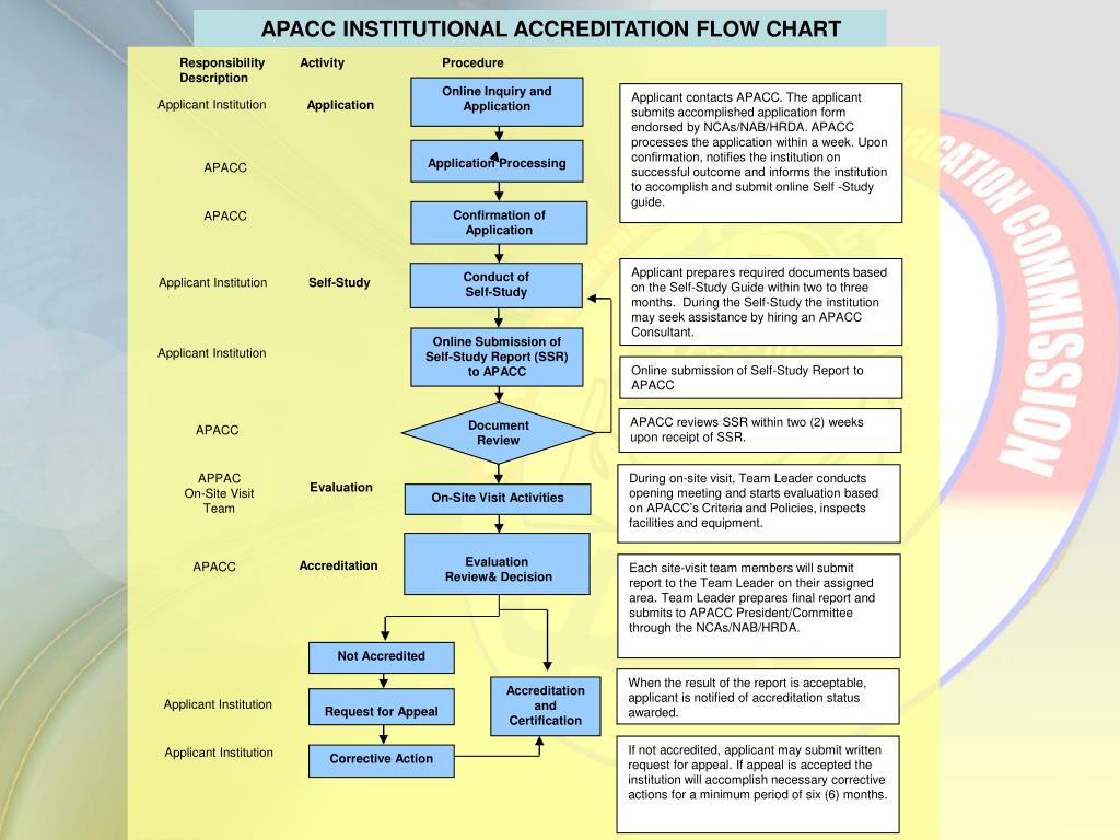 Flowchart of Main Activities Before On-site Visit Disseminating the APACC Accreditation Program Holding Consultancies (optional) Organizing and Mobilizing Self-Study Team Initiating the Process Organizing and Supporting the Team of Accreditors Conducting Self-Study Conducting and Hosting an Evaluation Visit