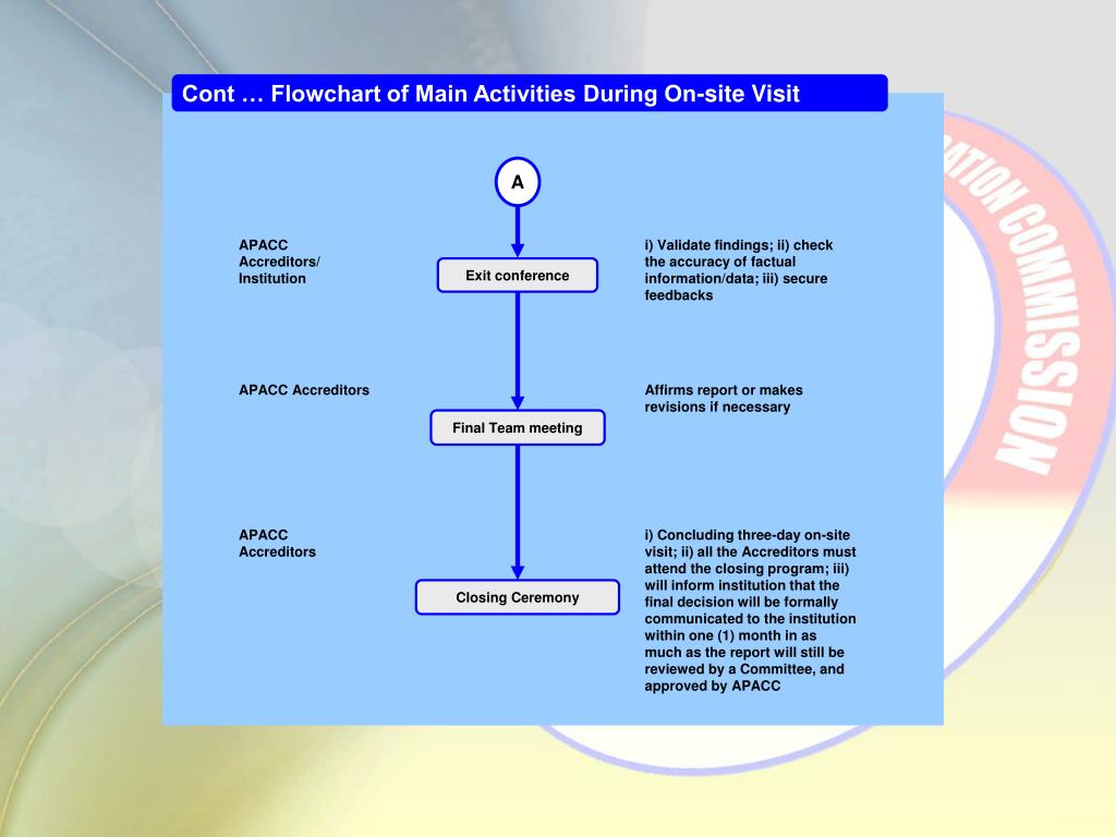 Cont … Flowchart of Main Activities During On-site Visit A Exit conference APACC Accreditors/ Institution i) Validate findings; ii) check the accuracy of factual information/data; iii) secure feedbacks Final Team meeting APACC Accreditors Affirms report or makes revisions if necessary Closing Ceremony APACC Accreditors i) Concluding three-day on-site visit; ii) all the Accreditors must attend the closing program; iii) will inform institution that the final decision will be formally communicated to the institution within one (1) month in as much as the report will still be reviewed by a Committee, and approved by APACC