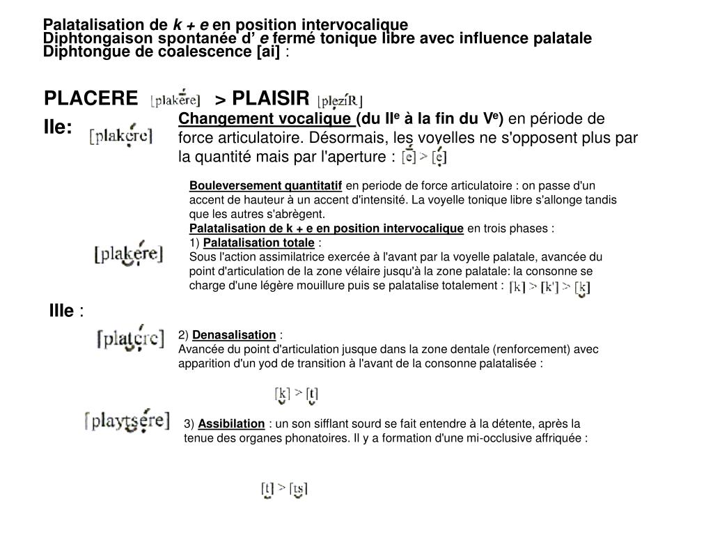 Palatalisation de k + e en position intervocaliqueDiphtongaison spontanée d’ e fermé tonique libre avec influence palataleDiphtongue de coalescence [ai] : Changement vocalique (du IIeà la fin du Ve) en période de force articulatoire. Désormais, les voyelles ne s'opposent plus par la quantité mais par l'aperture : PLACERE > PLAISIR IIe: Bouleversement quantitatif en periode de force articulatoire : on passe d'un accent de hauteur à un accent d'intensité. La voyelle tonique libre s'allonge tandis que les autres s'abrègent. Palatalisation de k + e en position intervocalique en trois phases :1) Palatalisation totale : Sous l'action assimilatrice exercée à l'avant par la voyelle palatale, avancée du point d'articulation de la zone vélaire jusqu'à la zone palatale: la consonne se charge d'une légère mouillure puis se palatalise totalement : IIIe : 2) Denasalisation : Avancée du point d'articulation jusque dans la zone dentale (renforcement) avec apparition d'un yod de transition à l'avant de la consonne palatalisée : 3) Assibilation : un son sifflant sourd se fait entendre à la détente, après la tenue des organes phonatoires. Il y a formation d'une mi-occlusive affriquée :