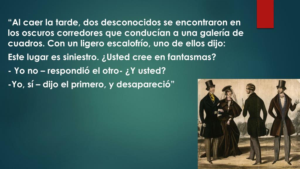 “Al caer la tarde, dos desconocidos se encontraron en los oscuros corredores que conducían a una galería de cuadros. Con un ligero escalofrío, uno de ellos dijo: Este lugar es siniestro. ¿Usted cree en fantasmas? - Yo no – respondió el otro- ¿Y usted? -Yo, sí – dijo el primero, y desapareció”
