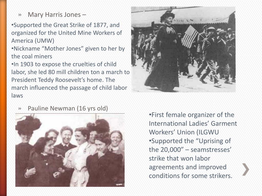 Supported the Great Strike of 1877, and organized for the United Mine Workers of America (UMW) • Nickname “Mother Jones” given to her by the coal miners • In 1903 to expose the cruelties of child labor, she led 80 mill children ton a march to President Teddy Roosevelt’s home. The march influenced the passage of child labor laws • Mary Harris Jones – • Pauline Newman (16 yrs old) • First female organizer of the International Ladies’ Garment Workers’ Union (ILGWU • Supported the “Uprising of the 20,000” – seamstresses’ strike that won labor agreements and improved conditions for some strikers.