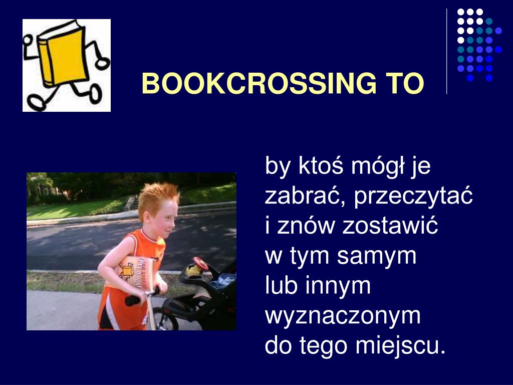 CO TO JEST BOOKCROSSING? w słowniku Concise Oxford English Dictionary (wrzesień 2004) napotykamy definicję że jest to: "praktyka zostawiania książki w publicznym miejscu aby została wzięta i przeczytana przez innych, którzy potem tak samo robią."