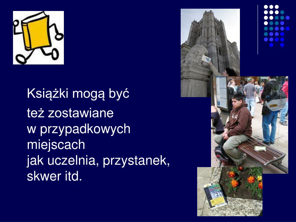 Książki mogą być też zostawianew przypadkowych miejscachjak uczelnia, przystanek,skwer itd.