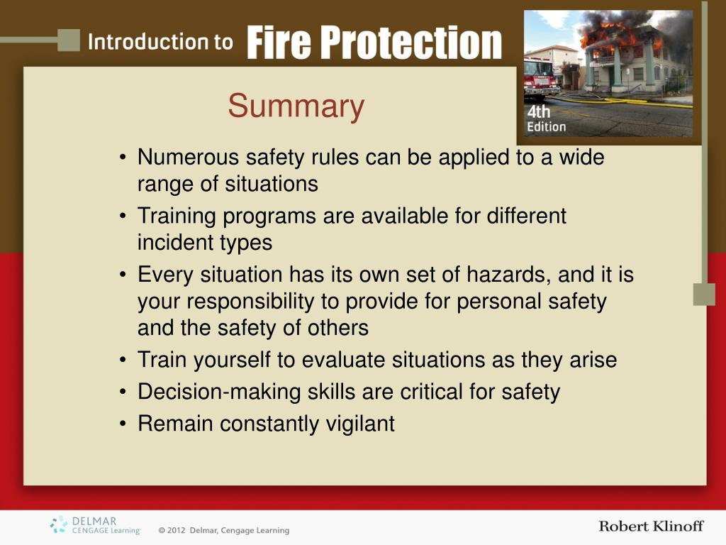 Summary • Numerous safety rules can be applied to a wide range of situations • Training programs are available for different incident types • Every situation has its own set of hazards, and it is your responsibility to provide for personal safety and the safety of others • Train yourself to evaluate situations as they arise • Decision-making skills are critical for safety • Remain constantly vigilant