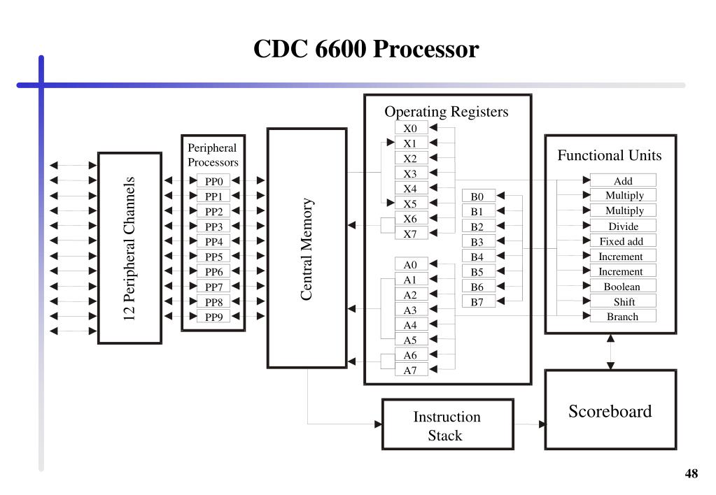 Operating Registers X0 X1 Peripheral Processors Functional Units X2 X3 Add PP0 X4 Multiply PP1 B0 X5 Multiply B1 PP2 X6 Divide B2 PP3 X7 Fixed add PP4 B3 Central Memory 12 Peripheral Channels Increment PP5 B4 A0 Increment PP6 B5 A1 Boolean B6 PP7 A2 Shift B7 PP8 A3 Branch PP9 A4 A5 A6 A7 Scoreboard Instruction Stack CDC 6600 Processor