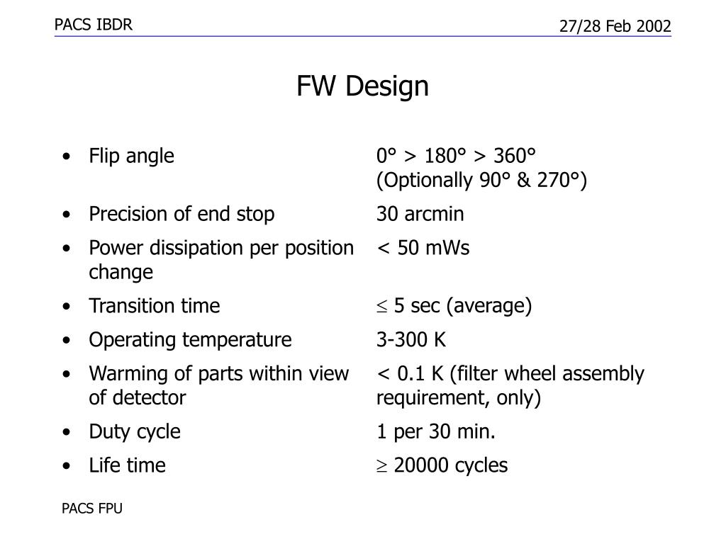 Flip angle Precision of end stop Power dissipation per position change Transition time Operating temperature Warming of parts within view of detector Duty cycle Life time 0° > 180° > 360°(Optionally 90° & 270°) 30 arcmin < 50 mWs 5 sec (average) 3-300 K < 0.1 K (filter wheel assembly requirement, only) 1 per 30 min. 20000 cycles FW Design PACS FPU