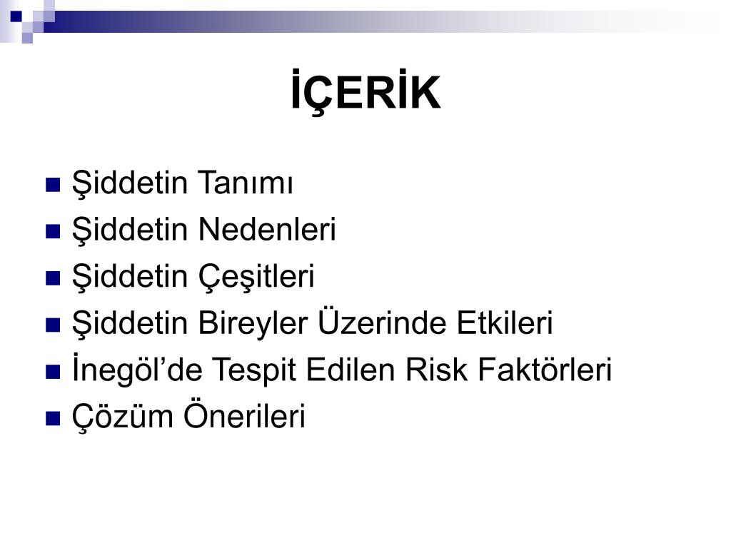 İÇERİK • Şiddetin Tanımı • Şiddetin Nedenleri • Şiddetin Çeşitleri • Şiddetin Bireyler Üzerinde Etkileri • İnegöl’de Tespit Edilen Risk Faktörleri • Çözüm Önerileri