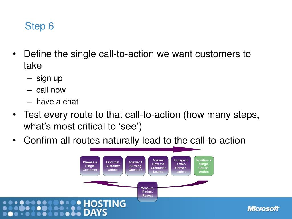 Step 6 • Define the single call-to-action we want customers to take • sign up • call now • have a chat • Test every route to that call-to-action (how many steps, what’s most critical to ‘see’) • Confirm all routes naturally lead to the call-to-action