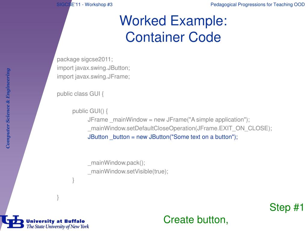 Worked Example:Container Code In course, code to create a JFrame is familiar from previous examples package sigcse2011; import javax.swing.JButton; import javax.swing.JFrame; public class GUI { public GUI() { JFrame _mainWindow = new JFrame("A simple application"); _mainWindow.setDefaultCloseOperation(JFrame.EXIT_ON_CLOSE); _mainWindow.pack(); _mainWindow.setVisible(true); } }