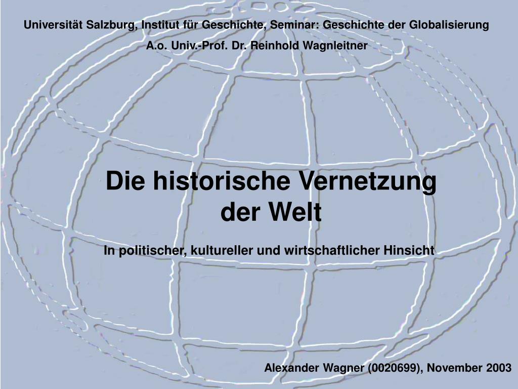 Universität Salzburg, Institut für Geschichte, Seminar: Geschichte der Globalisierung A.o. Univ.-Prof. Dr. Reinhold Wagnleitner. Die historische Vernetzung der Welt. In politischer, kultureller und wirtschaftlicher Hinsicht. Alexander Wagner (0020699), November 2003.