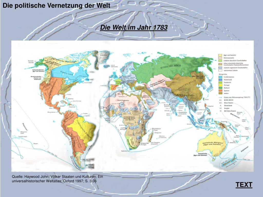 Die politische Vernetzung der Welt Die Welt im Jahr 1783 Quelle: Haywood John; Völker Staaten und Kulturen; Ein universalhistorischer Weltatlas; Oxford 1997; S. 3.06 TEXT