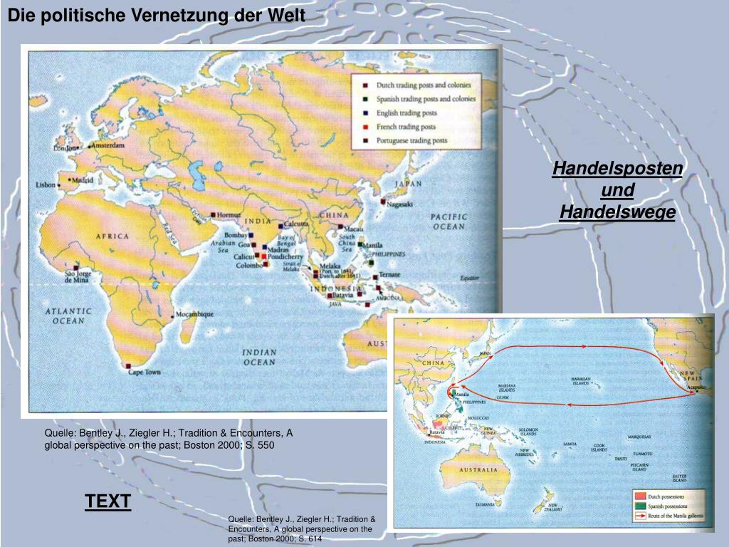 Die politische Vernetzung der Welt Handelsposten und Handelswege Quelle: Bentley J., Ziegler H.; Tradition & Encounters, A global perspective on the past; Boston 2000; S. 550 TEXT Quelle: Bentley J., Ziegler H.; Tradition & Encounters, A global perspective on the past; Boston 2000; S. 614