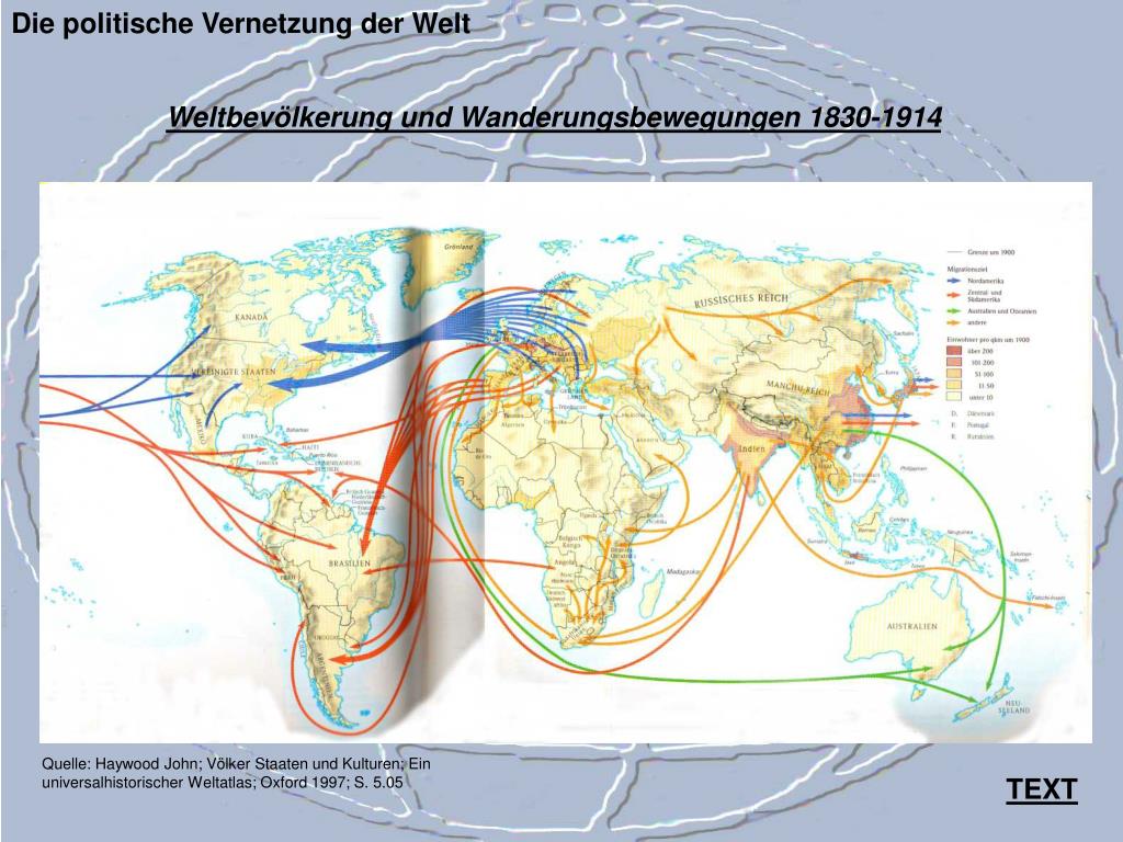 Die politische Vernetzung der Welt Weltbevölkerung und Wanderungsbewegungen 1830-1914 Quelle: Haywood John; Völker Staaten und Kulturen; Ein universalhistorischer Weltatlas; Oxford 1997; S. 5.05 TEXT