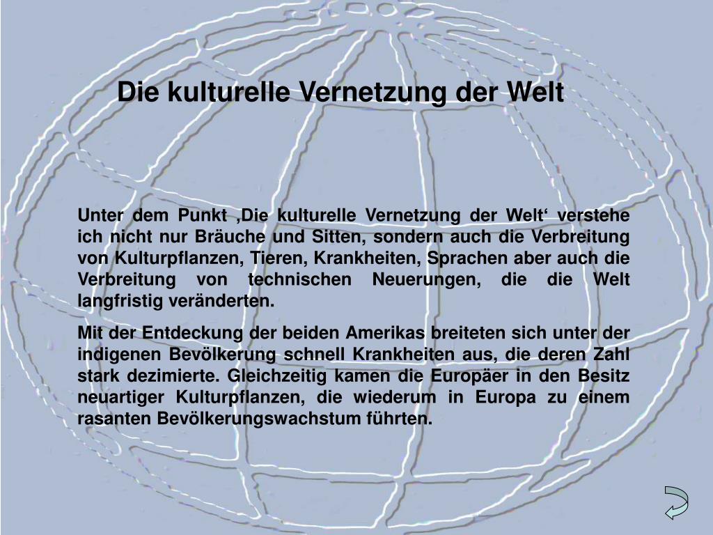 Die kulturelle Vernetzung der Welt Unter dem Punkt ‚Die kulturelle Vernetzung der Welt‘ verstehe ich nicht nur Bräuche und Sitten, sondern auch die Verbreitung von Kulturpflanzen, Tieren, Krankheiten, Sprachen aber auch die Verbreitung von technischen Neuerungen, die die Welt langfristig veränderten. Mit der Entdeckung der beiden Amerikas breiteten sich unter der indigenen Bevölkerung schnell Krankheiten aus, die deren Zahl stark dezimierte. Gleichzeitig kamen die Europäer in den Besitz neuartiger Kulturpflanzen, die wiederum in Europa zu einem rasanten Bevölkerungswachstum führten.