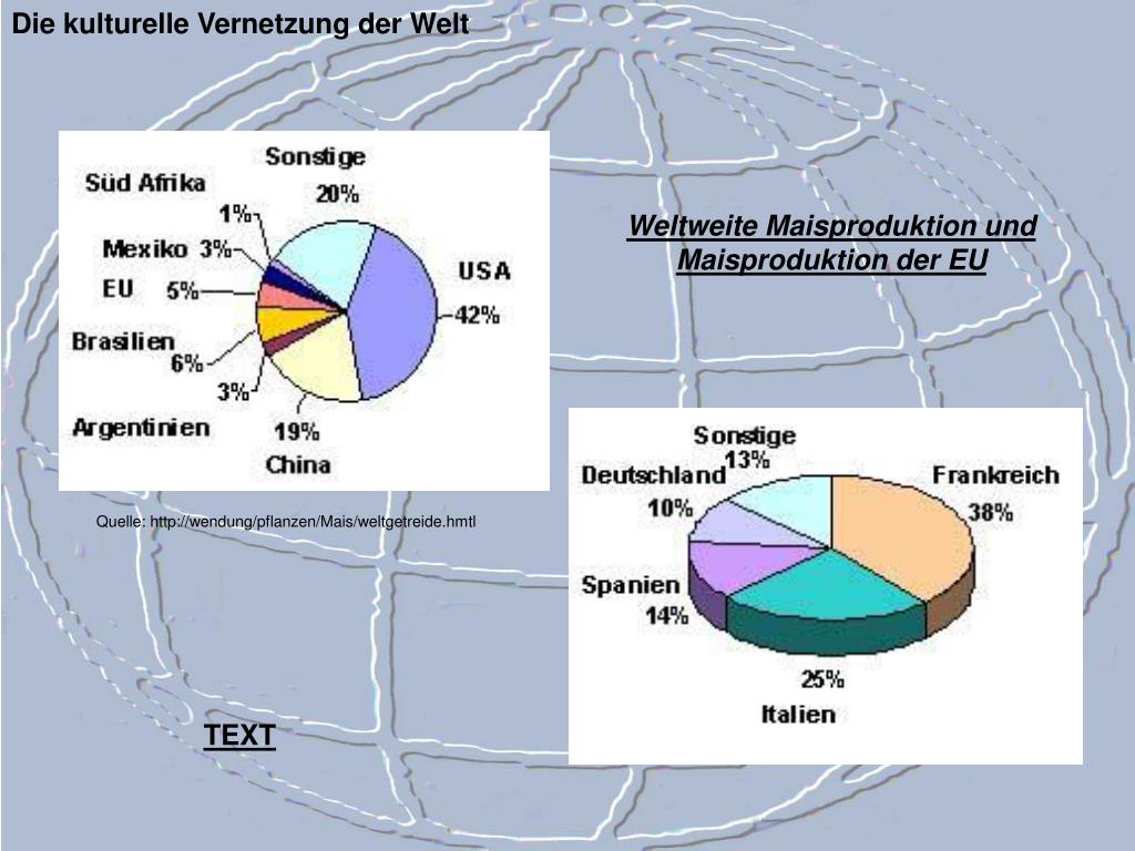 Die kulturelle Vernetzung der Welt Weltweite Maisproduktion und Maisproduktion der EU Quelle: http://wendung/pflanzen/Mais/weltgetreide.hmtl TEXT