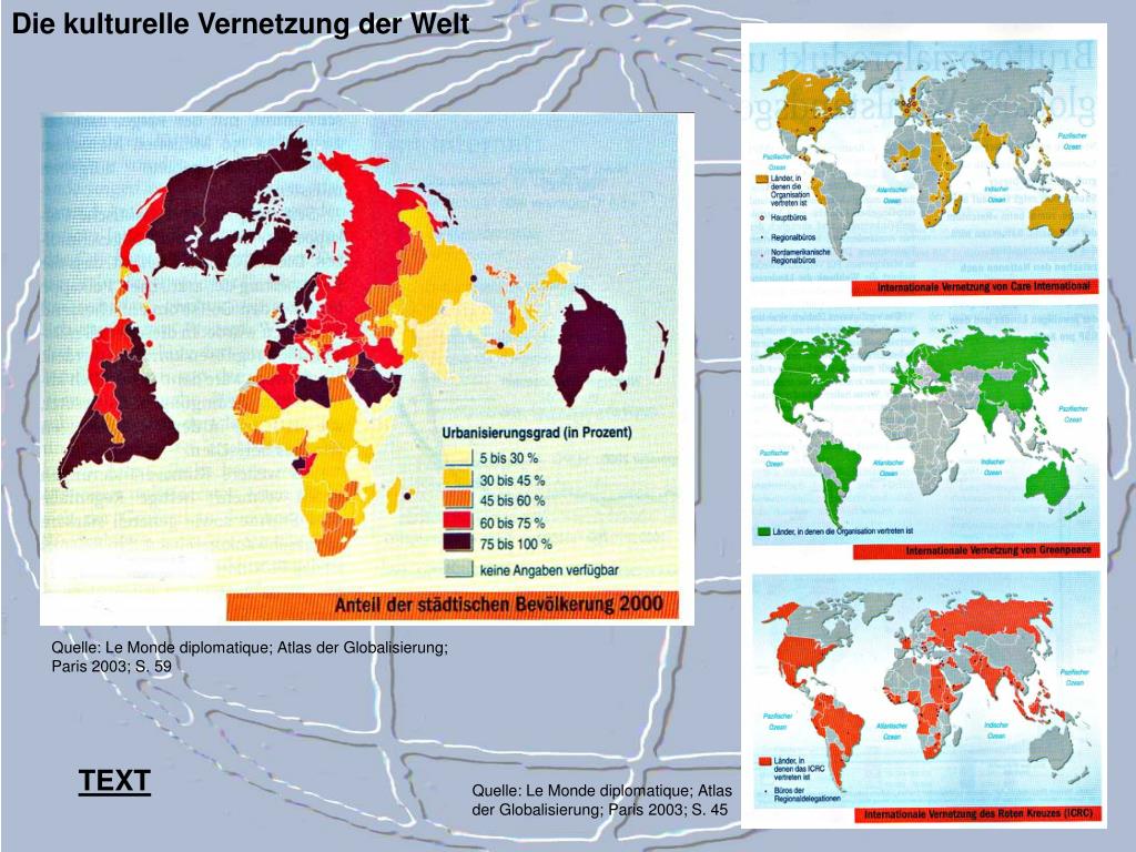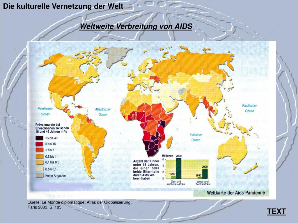 Die kulturelle Vernetzung der Welt Weltweite Verbreitung von AIDS Quelle: Le Monde diplomatique; Atlas der Globalisierung; Paris 2003; S. 185 TEXT
