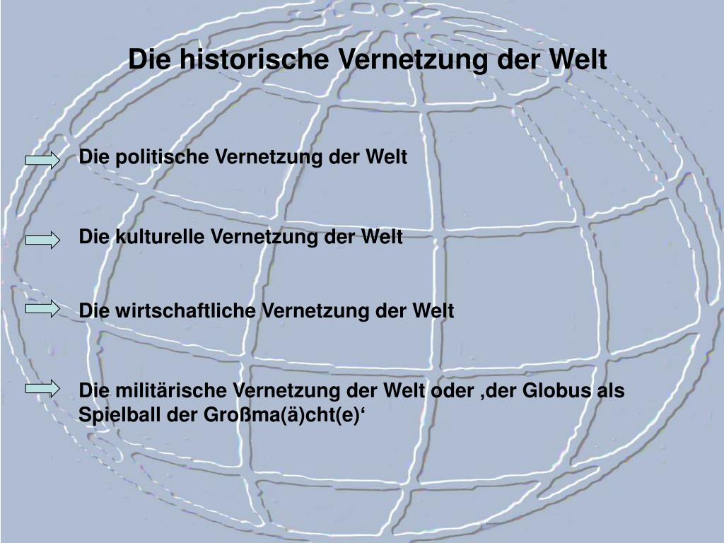 Die historische Vernetzung der Welt Die politische Vernetzung der Welt Die kulturelle Vernetzung der Welt Die wirtschaftliche Vernetzung der Welt Die militärische Vernetzung der Welt oder ‚der Globus als Spielball der Großma(ä)cht(e)‘