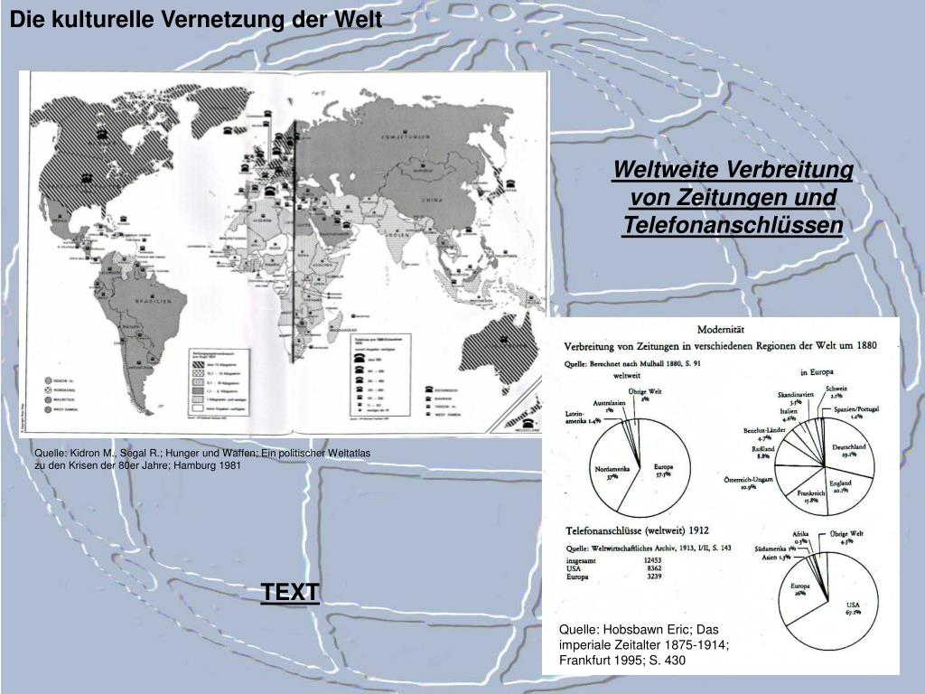 Die kulturelle Vernetzung der Welt Weltweite Verbreitung von Zeitungen und Telefonanschlüssen Quelle: Kidron M., Segal R.; Hunger und Waffen; Ein politischer Weltatlas zu den Krisen der 80er Jahre; Hamburg 1981 TEXT Quelle: Hobsbawn Eric; Das imperiale Zeitalter 1875-1914; Frankfurt 1995; S. 430