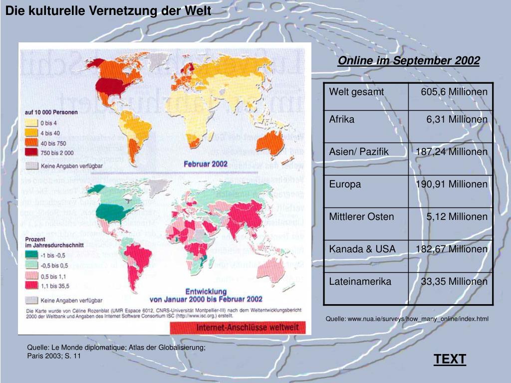 Die kulturelle Vernetzung der Welt Online im September 2002 Quelle: www.nua.ie/surveys/how_many_online/index.html Quelle: Le Monde diplomatique; Atlas der Globalisierung; Paris 2003; S. 11 TEXT