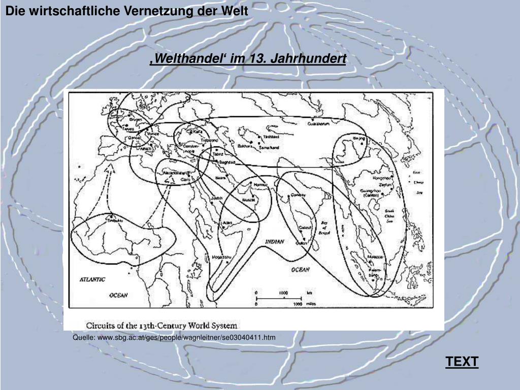 Die wirtschaftliche Vernetzung der Welt ‚Welthandel‘ im 13. Jahrhundert Quelle: www.sbg.ac.at/ges/people/wagnleitner/se03040411.htm TEXT