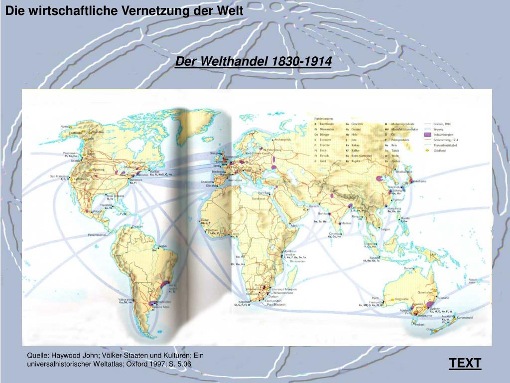 Die wirtschaftliche Vernetzung der Welt Der Welthandel 1830-1914 Quelle: Haywood John; Völker Staaten und Kulturen; Ein universalhistorischer Weltatlas; Oxford 1997; S. 5.06 TEXT
