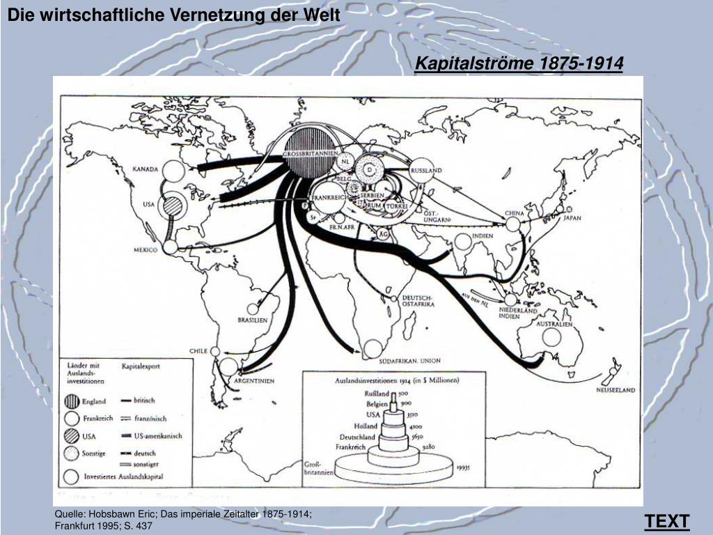 Die wirtschaftliche Vernetzung der Welt Kapitalströme 1875-1914 Quelle: Hobsbawn Eric; Das imperiale Zeitalter 1875-1914; Frankfurt 1995; S. 437 TEXT