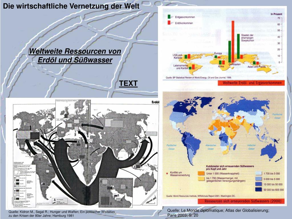 Die wirtschaftliche Vernetzung der Welt Weltweite Ressourcen von Erdöl und Süßwasser TEXT Quelle: Le Monde diplomatique; Atlas der Globalisierung; Paris 2003; S. 20 Quelle: Kidron M., Segal R.; Hunger und Waffen; Ein politischer Weltatlas zu den Krisen der 80er Jahre; Hamburg 1981