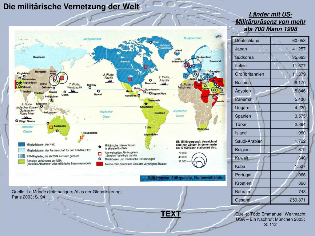 Die militärische Vernetzung der Welt Quelle: Le Monde diplomatique; Atlas der Globalisierung; Paris 2003; S. 36 TEXT