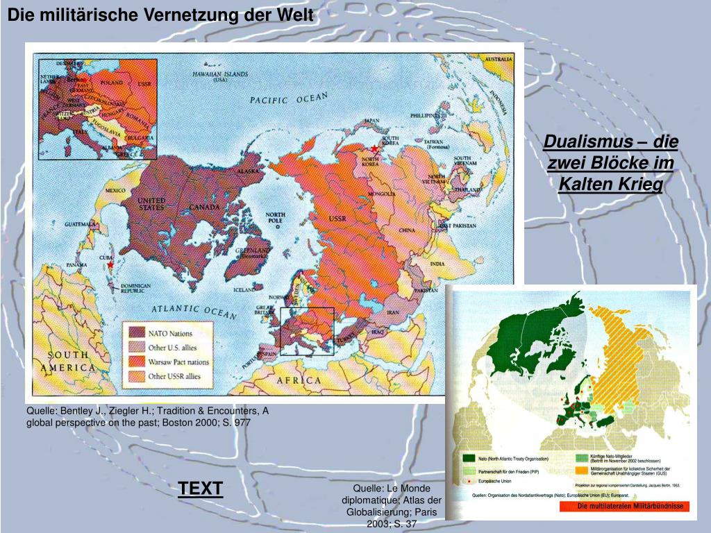 Die militärische Vernetzung der Welt Dualismus – die zwei Blöcke im Kalten Krieg Quelle: Bentley J., Ziegler H.; Tradition & Encounters, A global perspective on the past; Boston 2000; S. 977 TEXT Quelle: Le Monde diplomatique; Atlas der Globalisierung; Paris 2003; S. 37
