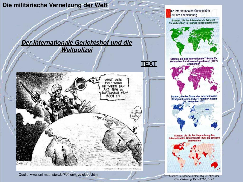 Die militärische Vernetzung der Welt Der internationale Gerichtshof und die Weltpolizei TEXT Quelle: www.uni-muenster.de/Pealon/krys-global.htm Quelle: Le Monde diplomatique; Atlas der Globalisierung; Paris 2003; S. 43