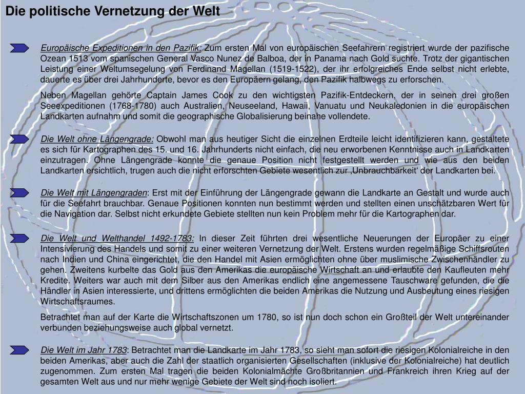 Die politische Vernetzung der Welt Europäische Expeditionen in den Pazifik: Zum ersten Mal von europäischen Seefahrern registriert wurde der pazifische Ozean 1513 vom spanischen General Vasco Nunez de Balboa, der in Panama nach Gold suchte. Trotz der gigantischen Leistung einer Weltumsegelung von Ferdinand Magellan (1519-1522), der ihr erfolgreiches Ende selbst nicht erlebte, dauerte es über drei Jahrhunderte, bevor es den Europäern gelang, den Pazifik halbwegs zu erforschen. Neben Magellan gehörte Captain James Cook zu den wichtigsten Pazifik-Entdeckern, der in seinen drei großen Seeexpeditionen (1768-1780) auch Australien, Neuseeland, Hawaii, Vanuatu und Neukaledonien in die europäischen Landkarten aufnahm und somit die geographische Globalisierung beinahe vollendete. Die Welt ohne Längengrade: Obwohl man aus heutiger Sicht die einzelnen Erdteile leicht identifizieren kann, gestaltete es sich für Kartographen des 15. und 16. Jahrhunderts nicht einfach, die neu erworbenen Kenntnisse auch in Landkarten einzutragen. Ohne Längengrade konnte die genaue Position nicht festgestellt werden und wie aus den beiden Landkarten ersichtlich, trugen auch die nicht erforschten Gebiete wesentlich zur ‚Unbrauchbarkeit‘ der Landkarten bei. Die Welt mit Längengraden: Erst mit der Einführung der Längengrade gewann die Landkarte an Gestalt und wurde auch für die Seefahrt brauchbar. Genaue Positionen konnten nun bestimmt werden und stellten einen unschätzbaren Wert für die Navigation dar. Selbst nicht erkundete Gebiete stellten nun kein Problem mehr für die Kartographen dar. Die Welt und Welthandel 1492-1783: In dieser Zeit führten drei wesentliche Neuerungen der Europäer zu einer Intensivierung des Handels und somit zu einer weiteren Vernetzung der Welt. Erstens wurden regelmäßige Schiffsrouten nach Indien und China eingerichtet, die den Handel mit Asien ermöglichten ohne über muslimische Zwischenhändler zu gehen. Zweitens kurbelte das Gold aus den Amerikas die europäische Wirtschaft an und erlaubte den Kaufleuten mehr Kredite. Weiters war auch mit dem Silber aus den Amerikas endlich eine angemessene Tauschware gefunden, die die Händler in Asien interessierte, und drittens ermöglichten die beiden Amerikas die Nutzung und Ausbeutung eines riesigen Wirtschaftsraumes. Betrachtet man auf der Karte die Wirtschaftszonen um 1780, so ist nun doch schon ein Großteil der Welt untereinander verbunden beziehungsweise auch global vernetzt. Die Welt im Jahr 1783: Betrachtet man die Landkarte im Jahr 1783, so sieht man sofort die riesigen Kolonialreiche in den beiden Amerikas, aber auch die Zahl der staatlich organisierten Gesellschaften (inklusive der Kolonialreiche) hat deutlich zugenommen. Zum ersten Mal tragen die beiden Kolonialmächte Großbritannien und Frankreich ihren Krieg auf der gesamten Welt aus und nur mehr wenige Gebiete der Welt sind noch isoliert.