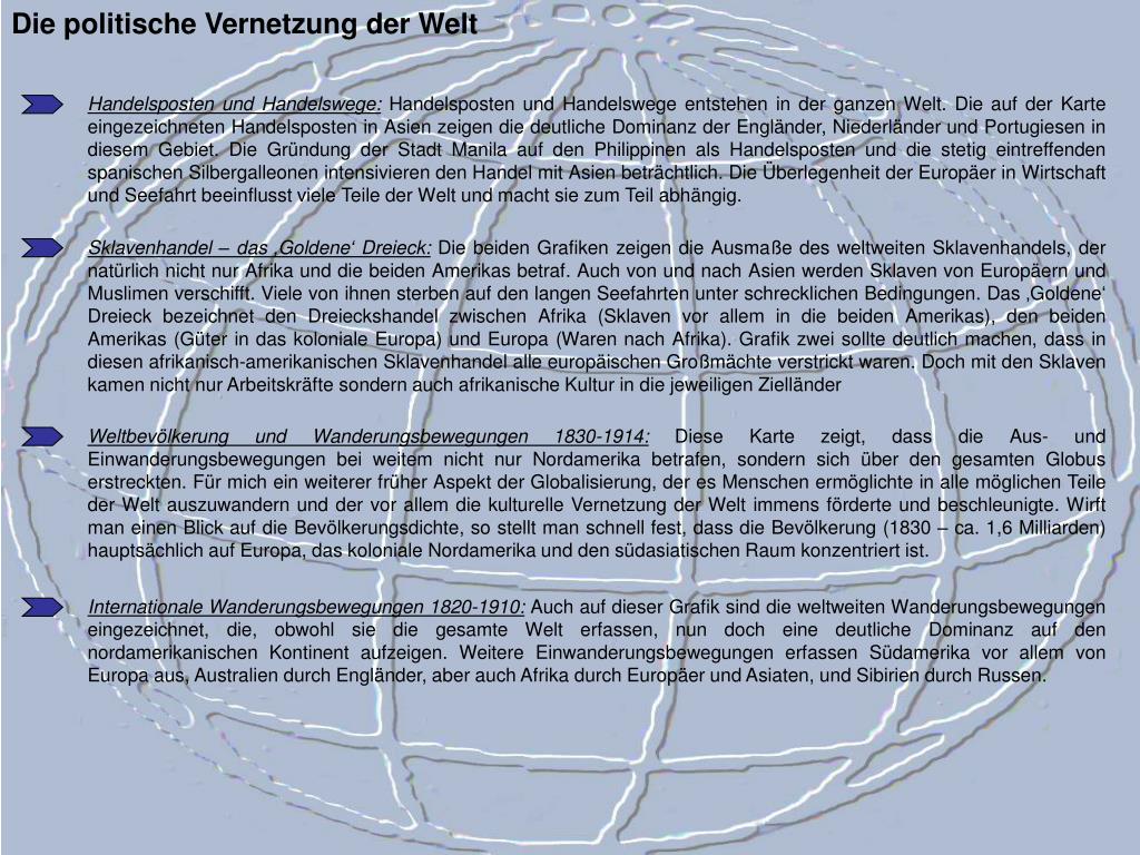 Die politische Vernetzung der Welt Handelsposten und Handelswege: Handelsposten und Handelswege entstehen in der ganzen Welt. Die auf der Karte eingezeichneten Handelsposten in Asien zeigen die deutliche Dominanz der Engländer, Niederländer und Portugiesen in diesem Gebiet. Die Gründung der Stadt Manila auf den Philippinen als Handelsposten und die stetig eintreffenden spanischen Silbergalleonen intensivieren den Handel mit Asien beträchtlich. Die Überlegenheit der Europäer in Wirtschaft und Seefahrt beeinflusst viele Teile der Welt und macht sie zum Teil abhängig. Sklavenhandel – das ‚Goldene‘ Dreieck: Die beiden Grafiken zeigen die Ausmaße des weltweiten Sklavenhandels, der natürlich nicht nur Afrika und die beiden Amerikas betraf. Auch von und nach Asien werden Sklaven von Europäern und Muslimen verschifft. Viele von ihnen sterben auf den langen Seefahrten unter schrecklichen Bedingungen. Das ‚Goldene‘ Dreieck bezeichnet den Dreieckshandel zwischen Afrika (Sklaven vor allem in die beiden Amerikas), den beiden Amerikas (Güter in das koloniale Europa) und Europa (Waren nach Afrika). Grafik zwei sollte deutlich machen, dass in diesen afrikanisch-amerikanischen Sklavenhandel alle europäischen Großmächte verstrickt waren. Doch mit den Sklaven kamen nicht nur Arbeitskräfte sondern auch afrikanische Kultur in die jeweiligen Zielländer Weltbevölkerung und Wanderungsbewegungen 1830-1914: Diese Karte zeigt, dass die Aus- und Einwanderungsbewegungen bei weitem nicht nur Nordamerika betrafen, sondern sich über den gesamten Globus erstreckten. Für mich ein weiterer früher Aspekt der Globalisierung, der es Menschen ermöglichte in alle möglichen Teile der Welt auszuwandern und der vor allem die kulturelle Vernetzung der Welt immens förderte und beschleunigte. Wirft man einen Blick auf die Bevölkerungsdichte, so stellt man schnell fest, dass die Bevölkerung (1830 – ca. 1,6 Milliarden) hauptsächlich auf Europa, das koloniale Nordamerika und den südasiatischen Raum konzentriert ist. Internationale Wanderungsbewegungen 1820-1910: Auch auf dieser Grafik sind die weltweiten Wanderungsbewegungen eingezeichnet, die, obwohl sie die gesamte Welt erfassen, nun doch eine deutliche Dominanz auf den nordamerikanischen Kontinent aufzeigen. Weitere Einwanderungsbewegungen erfassen Südamerika vor allem von Europa aus, Australien durch Engländer, aber auch Afrika durch Europäer und Asiaten, und Sibirien durch Russen.