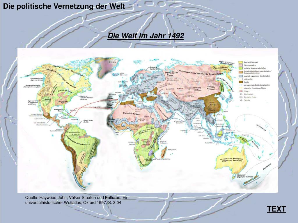 Die politische Vernetzung der Welt Die Welt im Jahr 1492 Quelle: Haywood John; Völker Staaten und Kulturen; Ein universalhistorischer Weltatlas; Oxford 1997; S. 3.04 TEXT