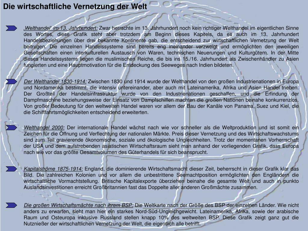 Die wirtschaftliche Vernetzung der Welt ‚Welthandel‘ im 13. Jahrhundert: Zwar herrschte im 13. Jahrhundert noch kein richtiger Welthandel im eigentlichen Sinne des Wortes, diese Grafik steht aber trotzdem am Beginn dieses Kapitels, da es auch im 13. Jahrhundert Handelsbeziehungen über drei bekannte Kontinente gab, die entscheidend zur wirtschaftlichen Vernetzung der Welt beitrugen. Die einzelnen Handelssysteme sind bereits eng ineinander verzweigt und ermöglichten den jeweiligen Gesellschaften einen interkulturellen Austausch von Waren, technischen Neuerungen und Kulturgütern. In der Mitte dieses Handelssystems liegen die muslimischen Reiche, die bis ins 15./16. Jahrhundert als Zwischenhändler zu Asien fungierten und eine Hauptmotivation für die Entdeckung des Seeweges nach Indien bildeten. Der Welthandel 1830-1914: Zwischen 1830 und 1914 wurde der Welthandel von den großen Industrienationen in Europa und Nordamerika bestimmt, die intensiv untereinander, aber auch mit Lateinamerika, Afrika und Asien Handel trieben. Der Großteil der Handelsinfrastruktur wurde von den Industrienationen geschaffen, und die Erfindung der Dampfmaschine beziehungsweise der Einsatz von Dampfschiffen machten die großen Nationen beinahe konkurrenzlos. Von großer Bedeutung für den weltweiten Handel waren vor allem der Bau der Kanäle von Panama, Suez und Kiel, die die Schifffahrtsmöglichkeiten entscheidend erweiterten. Welthandel 2000: Der internationale Handel wächst nach wie vor schneller als die Weltproduktion und ist somit ein Zeichen für die Öffnung und Verflechtung der nationalen Märkte. Preis dieser Vernetzung und des Wirtschaftswachstums sind zum Teil gravierende ökonomische, soziale und ökologische Ungleichheiten. Trotz der momentanen Vorherrschaft der USA und dem aufstrebenden asiatischen Wirtschaftsraum sieht man anhand der vorliegenden Grafik, dass Europa nach wie vor das größte Gesamtvolumen des Güterhandels für sich beansprucht. Kapitalströme 1875-1914: England, die dominierende Wirtschaftsmacht dieser Zeit, beherrscht in dieser Grafik klar das Bild. Die zahlreichen Kolonien und vor allem die unbestrittene Seemachtposition ermöglichten den Engländern die wirtschaftliche Vormachtstellung. Britische Kapitalexporte überziehen beinahe die gesamte Welt und auch in punkto Auslandsinvestitionen erreicht Großbritannien fast das Doppelte aller anderen Großmächte zusammen. Die großen Wirtschaftsmächte nach ihrem BSP: Die Weltkarte nach der Größe des BSP der einzelnen Länder. Wie nicht anders zu erwarten, sieht man hier ein starkes Nord-Süd-Ungleichgewicht. Lateinamerika, Afrika, sowie der arabische Raum und Osteuropa inklusive Russland stellen knapp 10% des weltweiten BSP. Diese Grafik zeigt ganz gut die Nutznießer der wirtschaftlichen Vernetzung der Welt, die eigentlich alle betrifft.