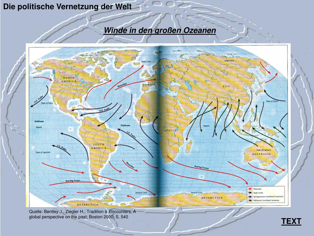Die politische Vernetzung der Welt Winde in den großen Ozeanen Quelle: Bentley J., Ziegler H.; Tradition & Encounters, A global perspective on the past; Boston 2000; S. 540 TEXT