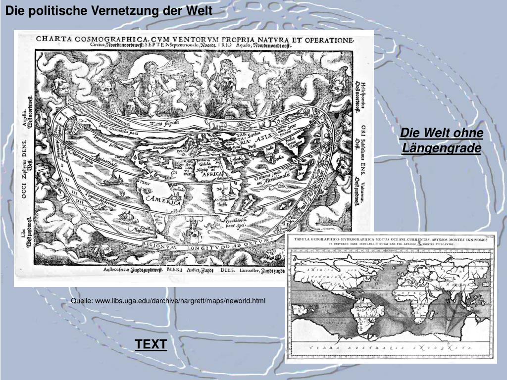Die politische Vernetzung der Welt Die Welt ohne Längengrade Quelle: www.libs.uga.edu/darchive/hargrett/maps/neworld.html TEXT