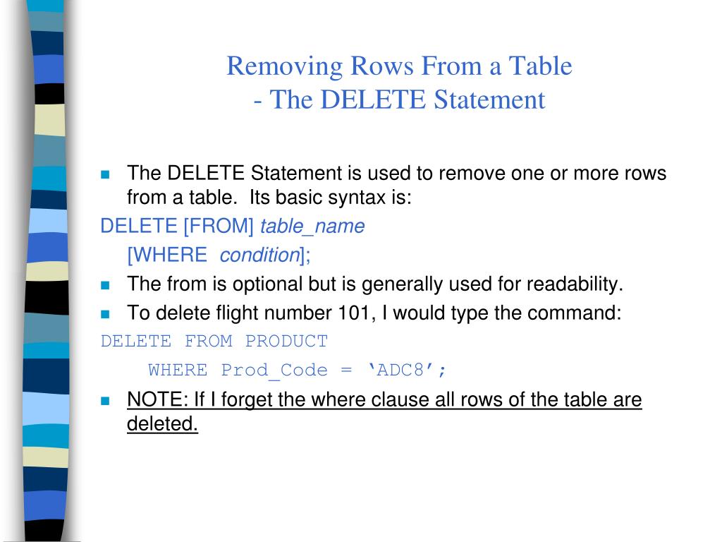 Removing Rows From a Table - The DELETE Statement • The DELETE Statement is used to remove one or more rows from a table. Its basic syntax is: DELETE [FROM] table_name [WHERE condition]; • The from is optional but is generally used for readability. • To delete flight number 101, I would type the command: DELETE FROM PRODUCT WHERE Prod_Code = ‘ADC8’; • NOTE: If I forget the where clause all rows of the table are deleted.