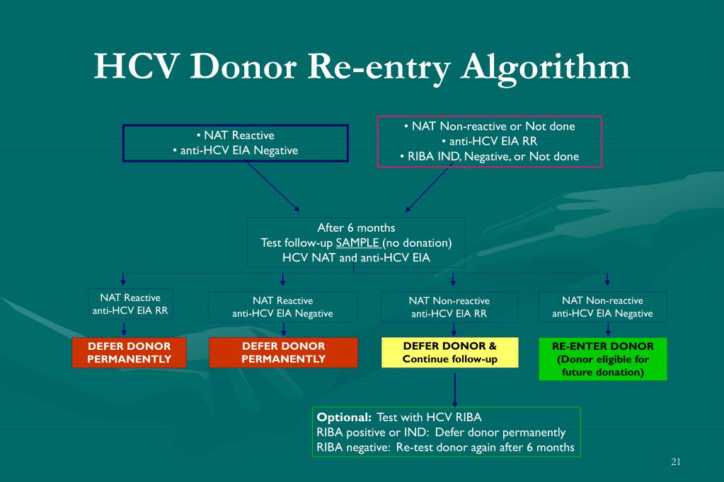 NAT Non-reactive or Not done • anti-HCV EIA RR • RIBA IND, Negative, or Not done • NAT Reactive • anti-HCV EIA Negative After 6 months Test follow-up SAMPLE (no donation) HCV NAT and anti-HCV EIA NAT Reactive anti-HCV EIA RR NAT Non-reactive anti-HCV EIA Negative NAT Reactive anti-HCV EIA Negative NAT Non-reactive anti-HCV EIA RR DEFER DONOR & Continue follow-up DEFER DONOR PERMANENTLY DEFER DONOR PERMANENTLY RE-ENTER DONOR (Donor eligible for future donation) Optional: Test with HCV RIBA RIBA positive or IND: Defer donor permanently RIBA negative: Re-test donor again after 6 months HCV Donor Re-entry Algorithm