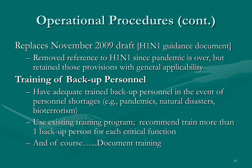 Operational Procedures (cont.) Replaces November 2009 draft [H1N1 guidance document] • Removed reference to H1N1 since pandemic is over, but retained those provisions with general applicability Training of Back-up Personnel • Have adequate trained back-up personnel in the event of personnel shortages (e.g., pandemics, natural disasters, bioterrorism) • Use existing training program; recommend train more than 1 back-up person for each critical function • And of course…...Document training