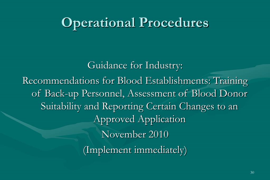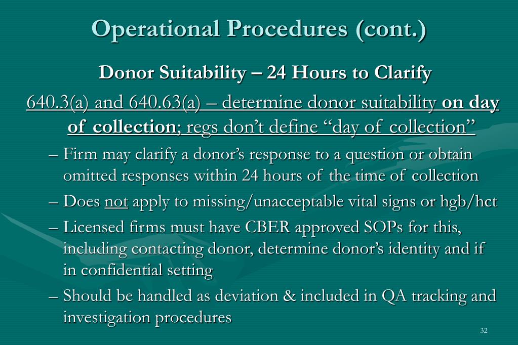 Operational Procedures (cont.) Donor Suitability – 24 Hours to Clarify 640.3(a) and 640.63(a) – determine donor suitability on day of collection; regs don’t define “day of collection” • Firm may clarify a donor’s response to a question or obtain omitted responses within 24 hours of the time of collection • Does not apply to missing/unacceptable vital signs or hgb/hct • Licensed firms must have CBER approved SOPs for this, including contacting donor, determine donor’s identity and if in confidential setting • Should be handled as deviation & included in QA tracking and investigation procedures