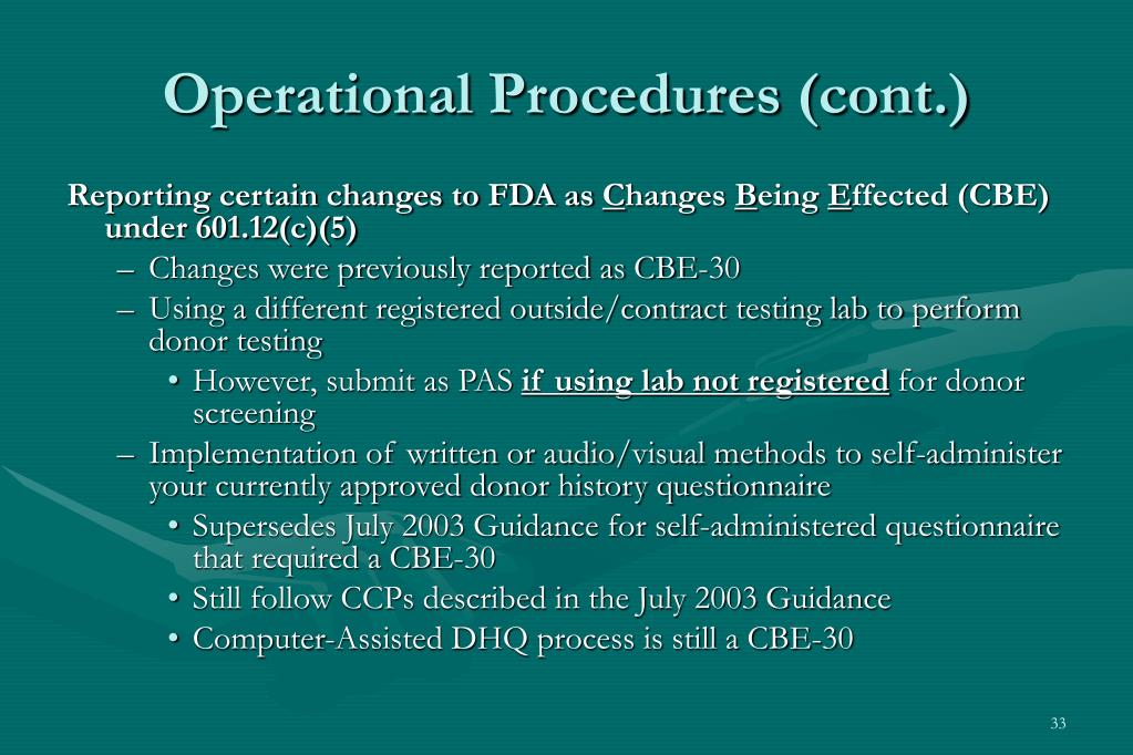 Operational Procedures (cont.) Reporting certain changes to FDA as Changes Being Effected (CBE) under 601.12(c)(5) • Changes were previously reported as CBE-30 • Using a different registered outside/contract testing lab to perform donor testing • However, submit as PAS if using lab not registered for donor screening • Implementation of written or audio/visual methods to self-administer your currently approved donor history questionnaire • Supersedes July 2003 Guidance for self-administered questionnaire that required a CBE-30 • Still follow CCPs described in the July 2003 Guidance • Computer-Assisted DHQ process is still a CBE-30