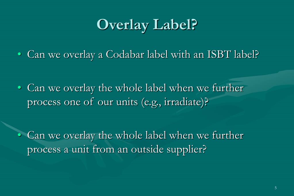 Overlay Label? • Can we overlay a Codabar label with an ISBT label? • Can we overlay the whole label when we further process one of our units (e.g., irradiate)? • Can we overlay the whole label when we further process a unit from an outside supplier?