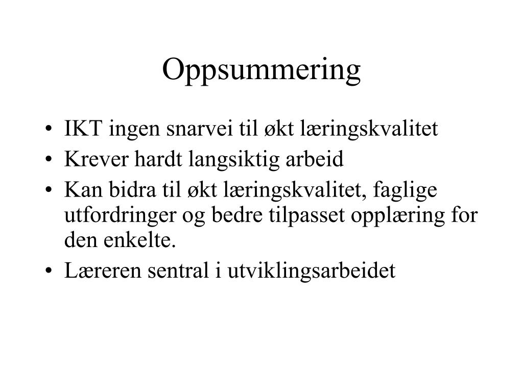 Oppsummering • IKT ingen snarvei til økt læringskvalitet • Krever hardt langsiktig arbeid • Kan bidra til økt læringskvalitet, faglige utfordringer og bedre tilpasset opplæring for den enkelte. • Læreren sentral i utviklingsarbeidet